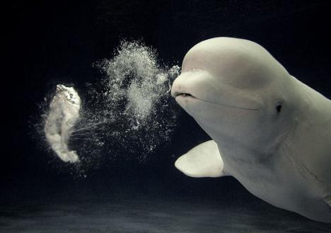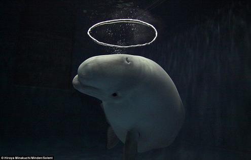 生活在日本島根縣水族館的白鯨共有3頭,圖中白鯨是其中之一。憑借在水中吐泡泡這種引人注目的表演,3頭白鯨成為游人推崇的對象。島根縣水族館共生活著1萬只動物,白鯨是其中最吸引游人目光的動物之一。這位日本攝影師Hiroya Minakuchi是在島根縣水族館拍到這頭白鯨吐泡泡畫面的。自從白鯨無師自通地學會了吹出一個像天使光圈狀的泡泡之后,她就成了島根水族館里的“紅人”。這頭可愛的小白鯨約10歲,三年多前學會了吹氣泡這門技巧,從此,憑借這獨門絕技迷倒了一大批來此參觀的游客。
